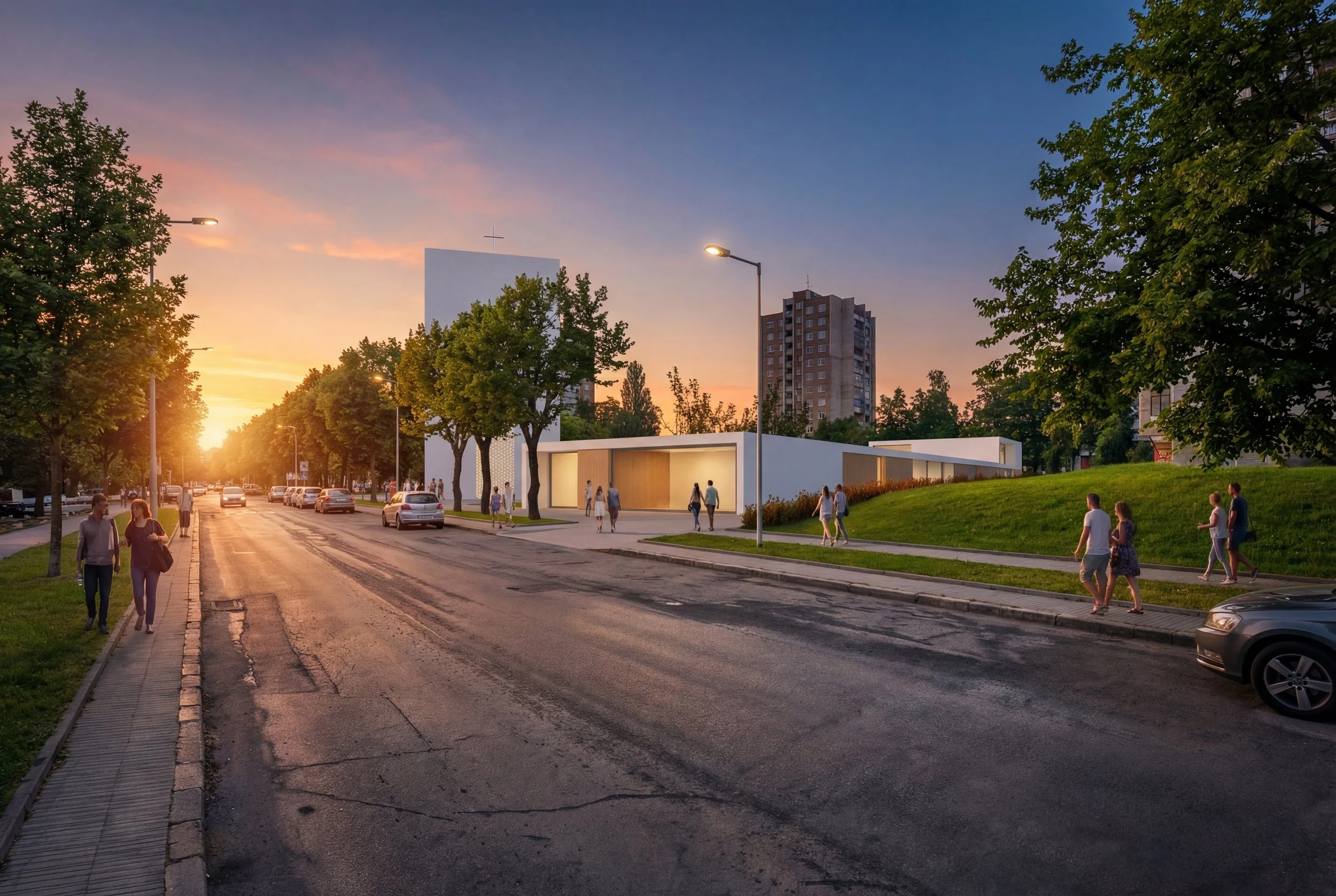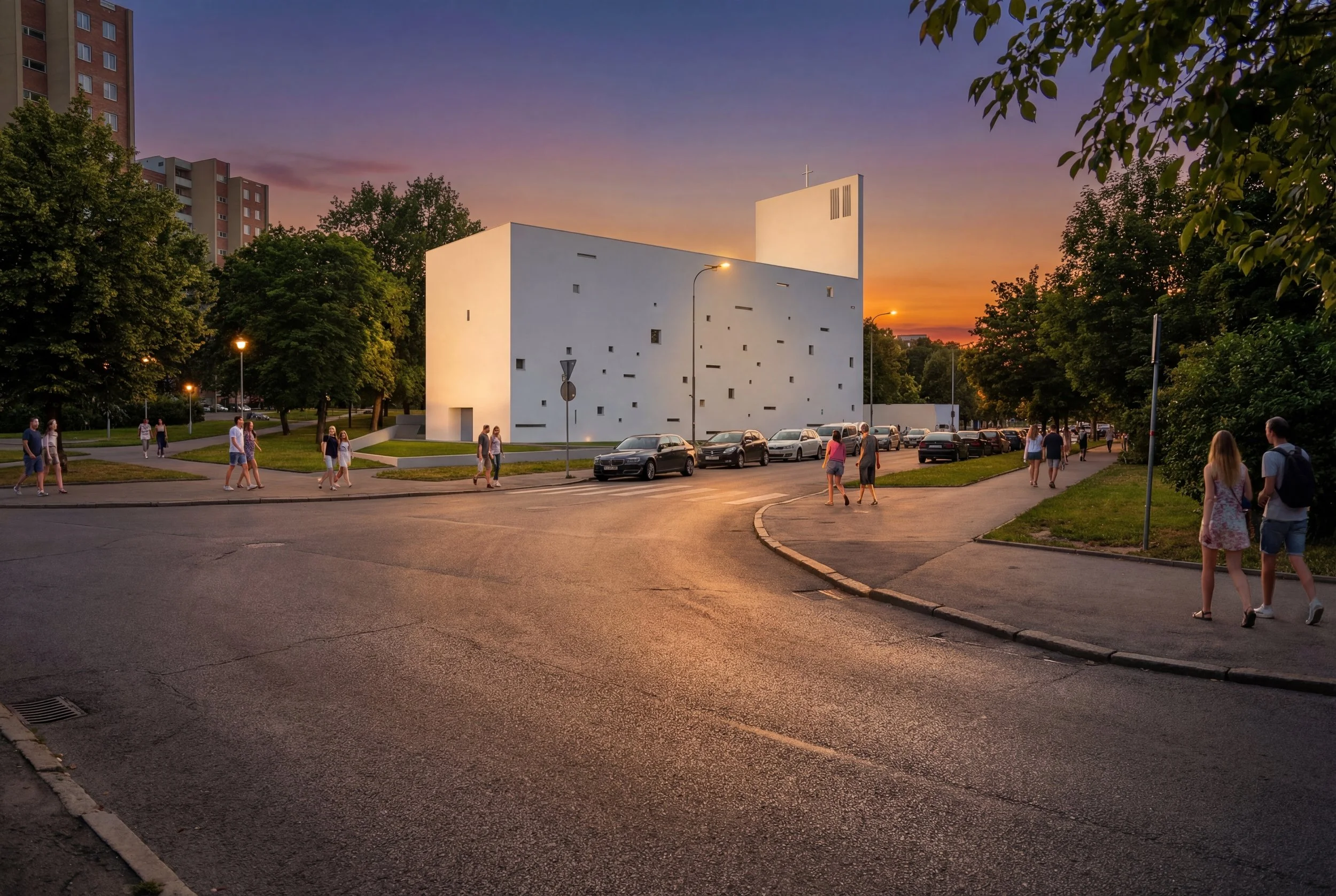 Concept design for the Christ Resurrection Church in Šiauliai, Lithuania. The new church is a celebration of light and unity, a place dedicated to family and faith. The new building is white, spacious and full of joy, standing in contrast with surrounding Post-Soviet residential blocks.