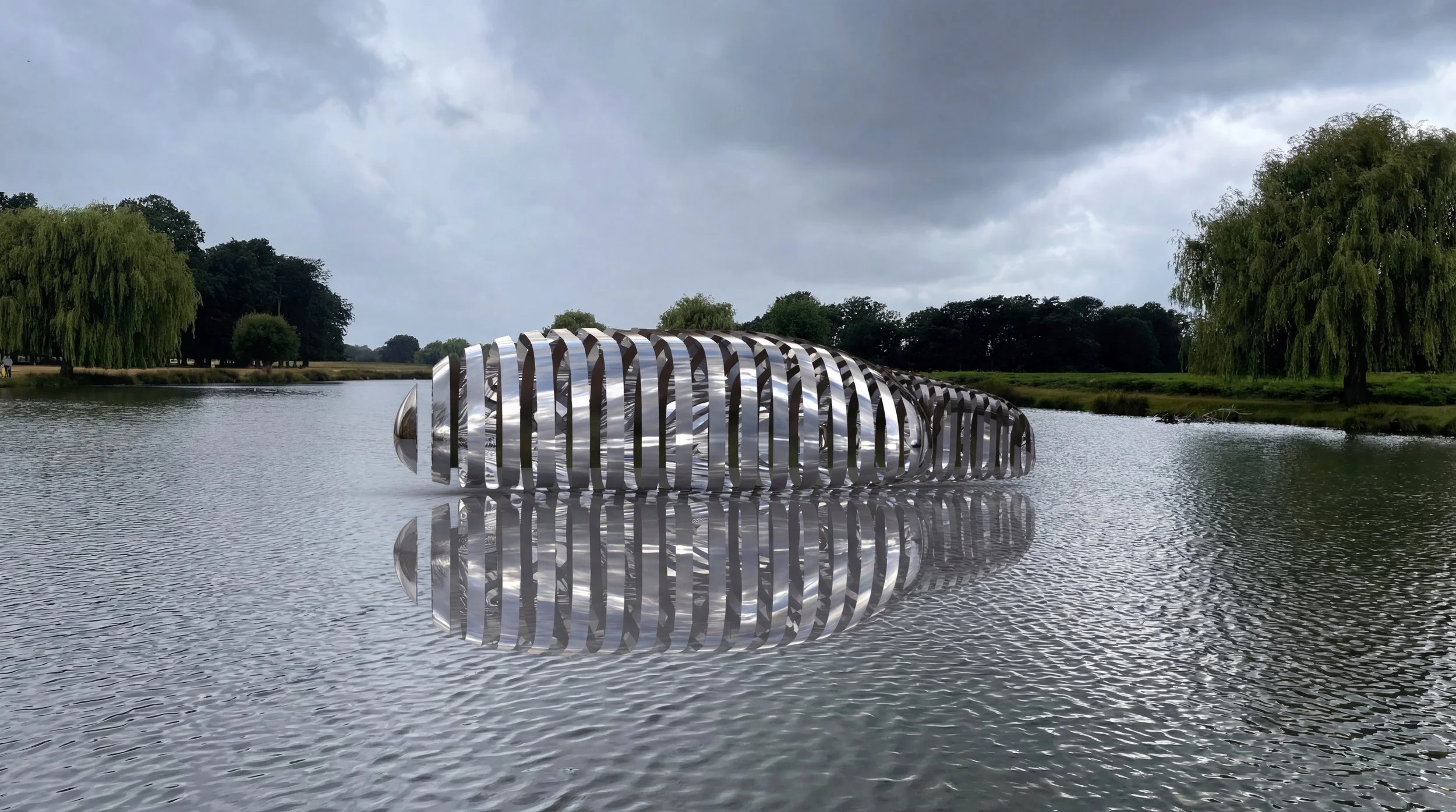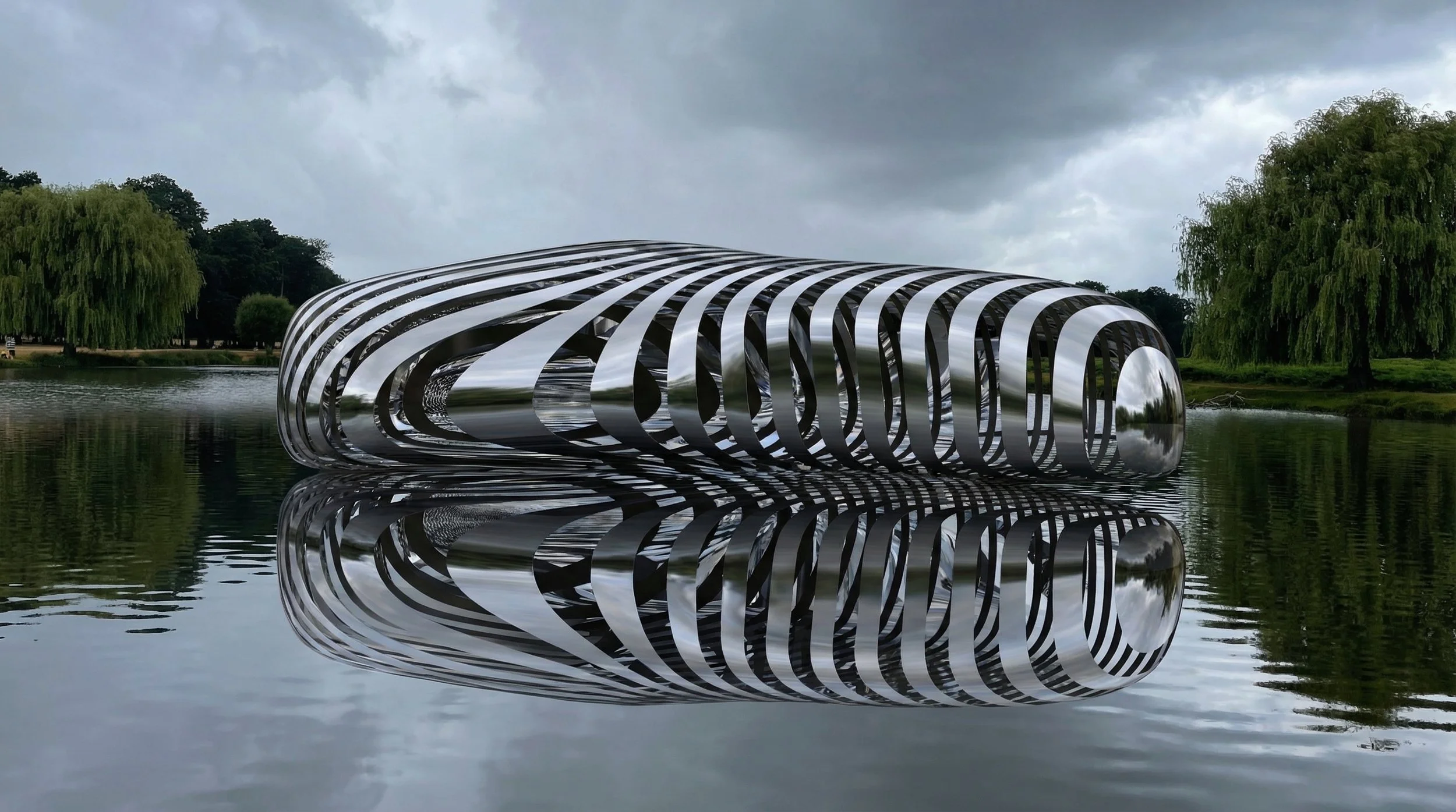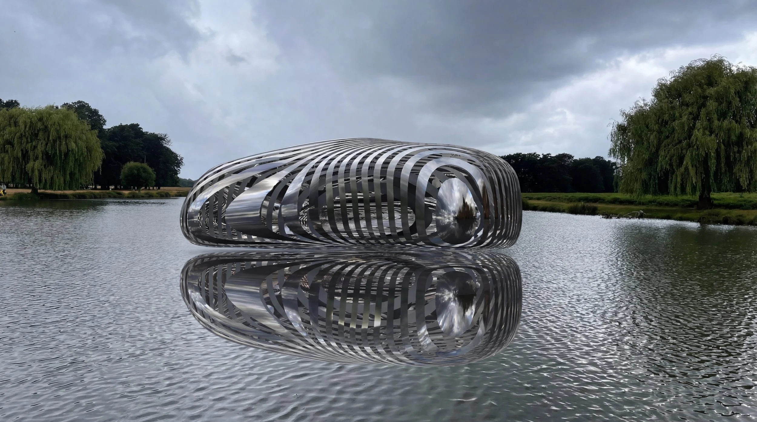 Concept vision for the pavilion on the lake as a floating structure made in stainless steel with polished chrome finish, a shelter for wild birds and anglers.
